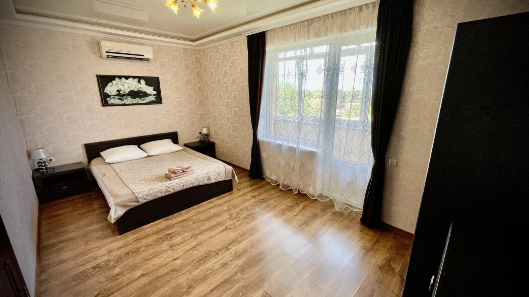 - Мебель: вешалка, диван раскладной, зеркало, кровать двуспальная, прикроватные тумбочки, стол, стулья, шкаф
